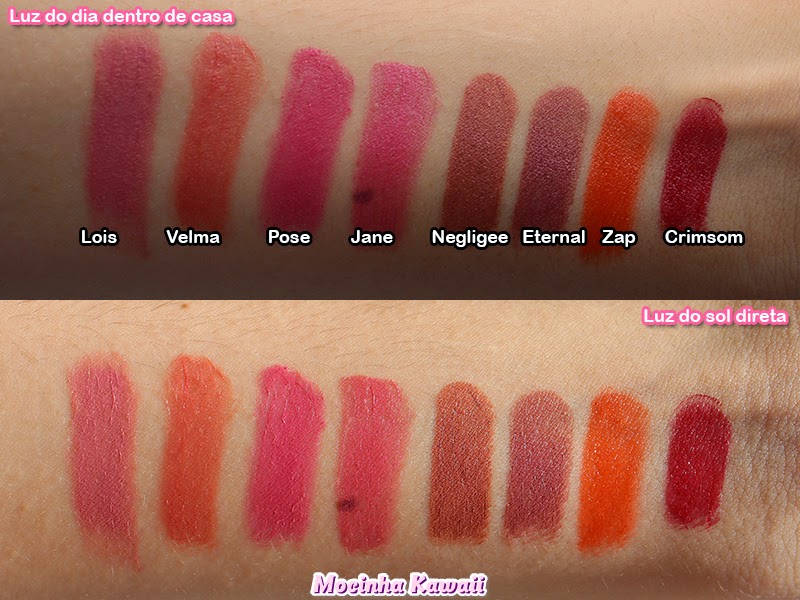 O Lois e o Velma são os meus preferidos. São os primeiros que pego quando quero usar um batom rosado. Eu amaria mais ainda o Velma se ele não tivesse tanto brilhinho (no sol fica uma explosão de brilho).